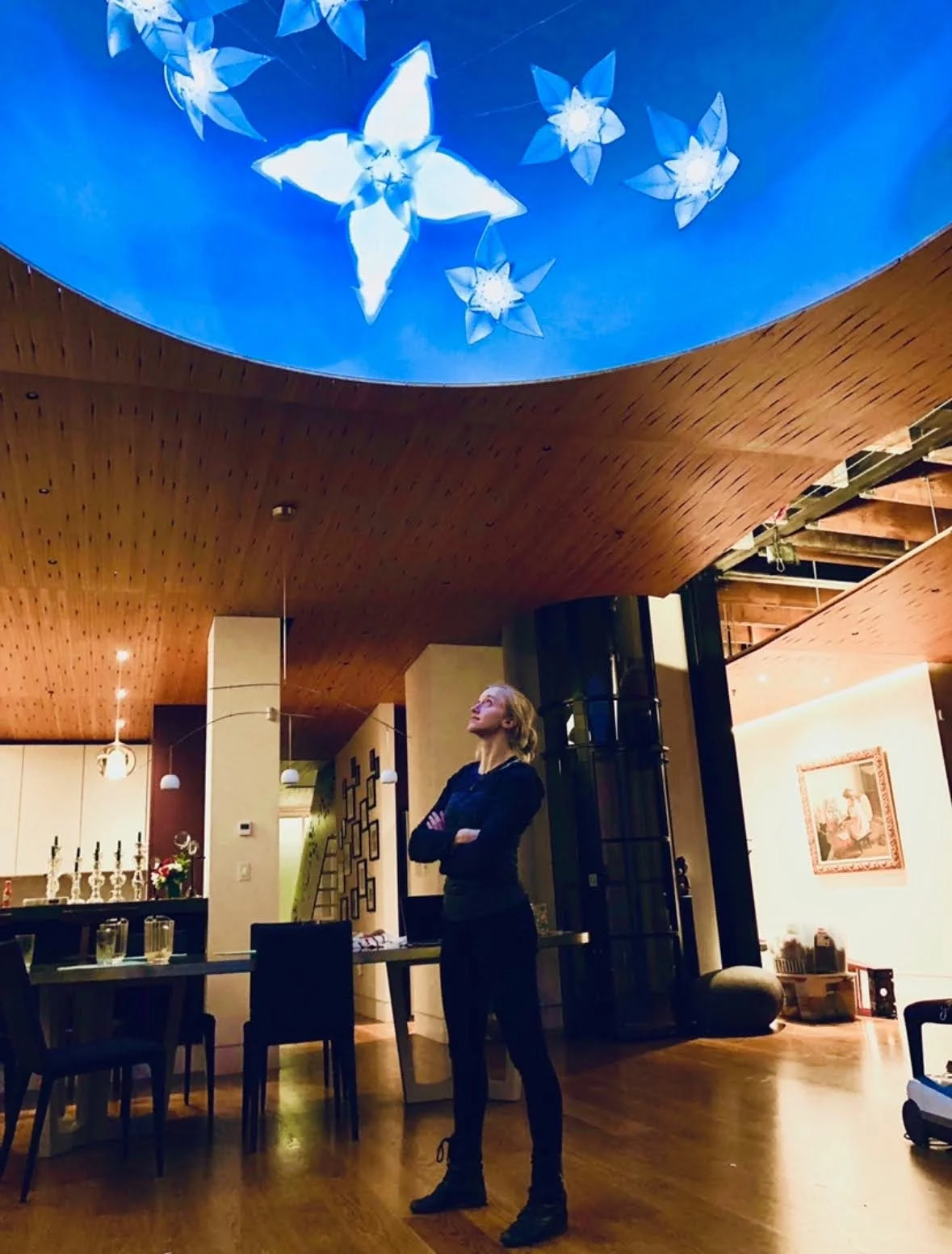 "Descant" is a mesmerizing sculptural installation that transforms the architectural space of a private residence into a canvas for artistic expression. Suspended within the embrace of a skylight, this piece comprises a constellation of delicate, flower-like forms that seem to float ethereally against the backdrop of the sky. By day, natural light filters through the translucent petals, casting a cascade of luminous, organic patterns within the interior space. By night, the installation takes on a different character; the internal lighting elements within each flower imbue the space with an ethereal glow reminiscent of celestial bodies in the night sky. The name "Descant," typically a term for a high toned melodious counterpoint in music, here suggests a lofty visual harmony with the architecture. This artwork not only enhances the aesthetic appeal of the residence but also alters the experience of the space, inviting those within to look up and contemplate the beauty of both the crafted and the natural world.